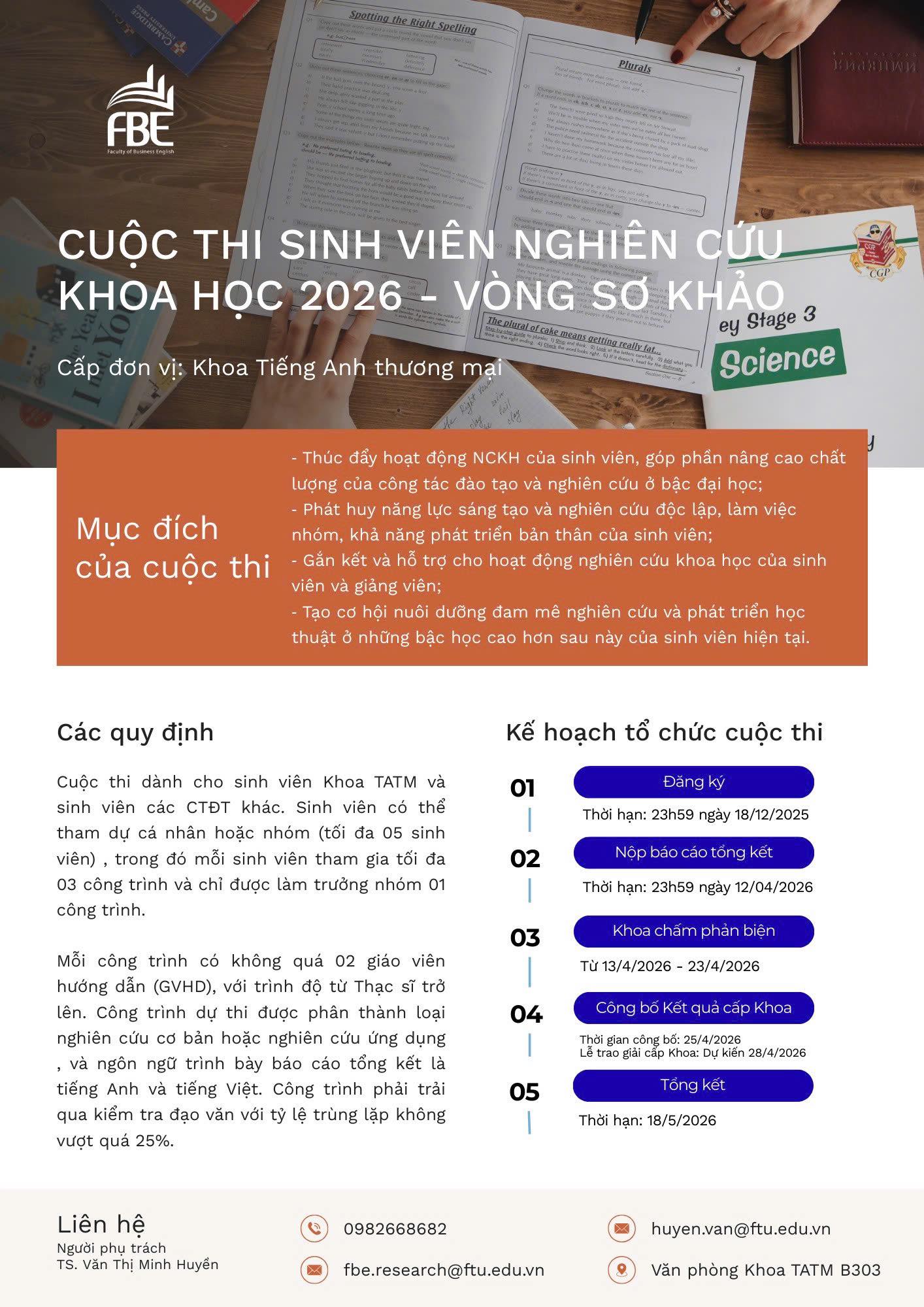 ◦ Email: fbe.research@ftu.edu.vn (Tiêu đề: “Hỏi về Cuộc thi SVNCKH 2026 của Khoa TATM”).