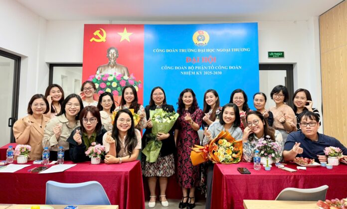 Có thể là hình ảnh về một hoặc nhiều người và văn bản cho biết 'ん 八cロWA1 CÔNG ĐOÀN TRƯỜNG TRU ĐẠI HỌC NGOẠI THƯƠNG ĐẠI ĐẠIHỘI HỘI CÔNG ĐOÀN BỘ PHẬN/TÔ PHAN/TỔCÔNG CÔNG DOÀN NHIỆM KY 2025-2030 LÓITHOÁT ٢ ĐOÀN THƯKY THƯ YOL'