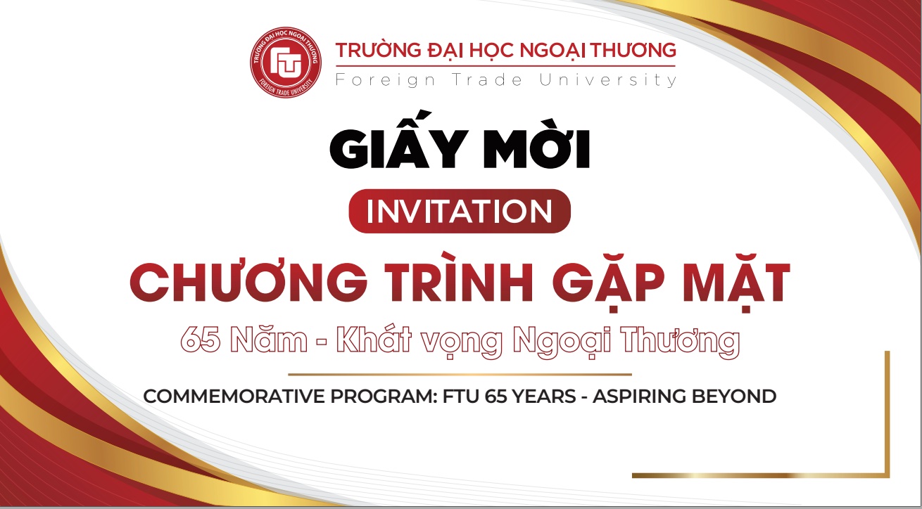 Có thể là hình ảnh về văn bản cho biết 'University நாழര NCON ច TRƯỜNG ĐẠI HỌC NGOẠI THƯƠNG EX Foreign Trade GIẤY MỜI INVITATION CHƯƠNG TRÌNH GẶP MẶT 65 Năm 0 Khắt vong vọng Ngoại Thương COMMEMORATIVE PROGRAM: FTU 65 YEARS ASPIRING BEYOND'