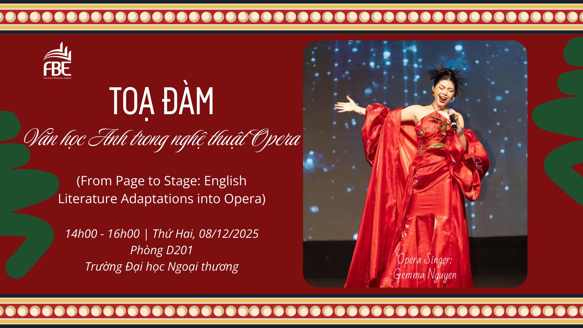 Đặc biệt sự kiện tọa đàm sẽ có sự tham gia của GIẢNG VIÊN THANH NHẠC TẠI TRƯỜNG ĐẠI HỌC SƯ PHẠM NGHỆ THUẬT TRUNG ƯƠNG, CA SĨ, NHẠC SĨ GEMMA NGUYEN.